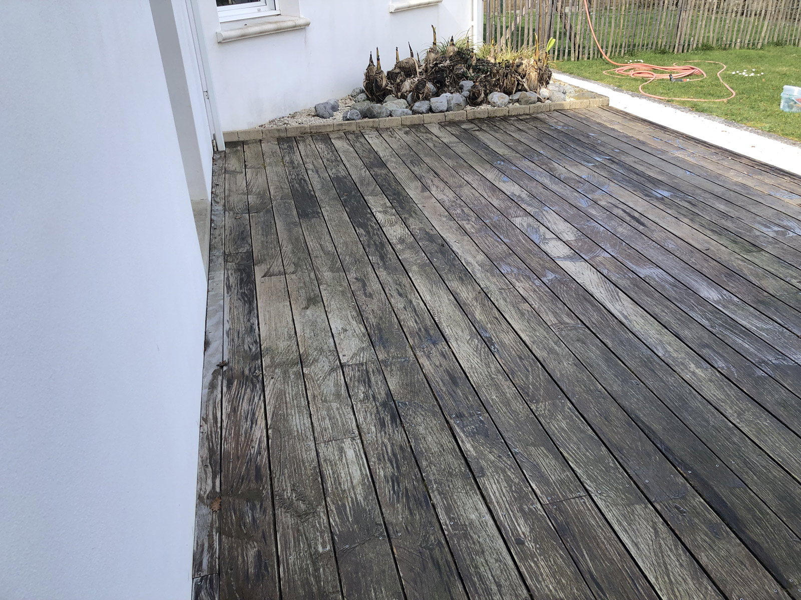 En fonction du degré de vieillissement, nous pouvons appliquer un dégrisant (tous les 2 à 3 ans), ce qui permettra de retirer les traces de grisaillement et contribuera à raviver la couleur d’origine de votre terrasse. Cette étape permettra également de préparer le support pour l’application d’un saturateur.